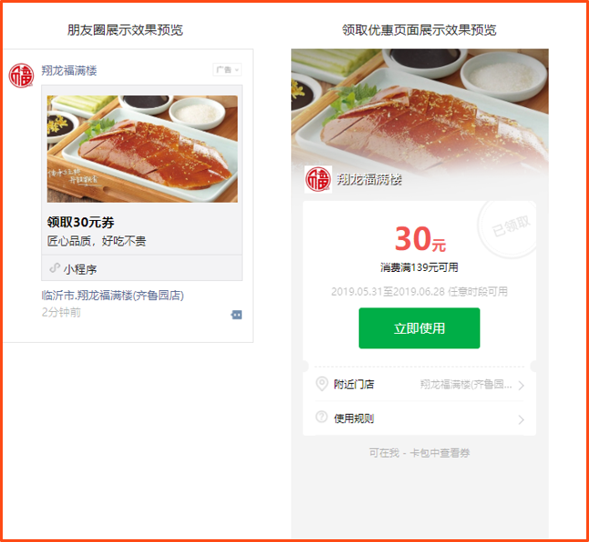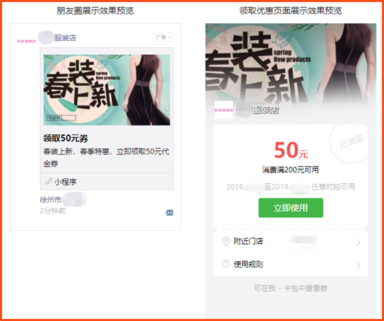 1.领取代金券:目标顾客在朋友圈点击广告即可领取代金券券