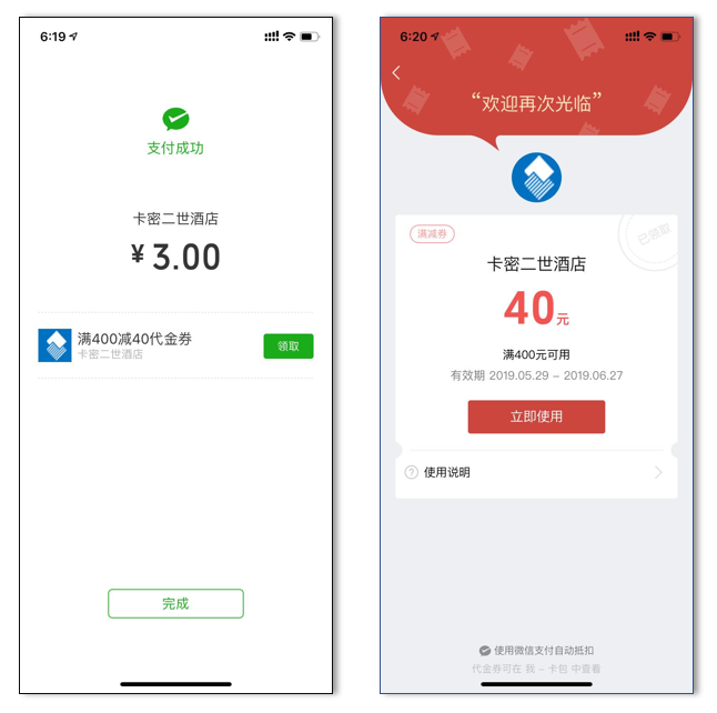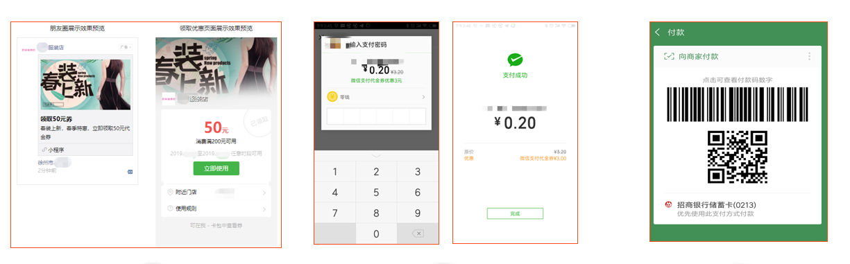 3.代金券核销:领券顾客到店通过微信支付进行核销(券有效期≧10天)