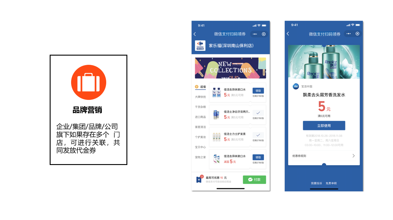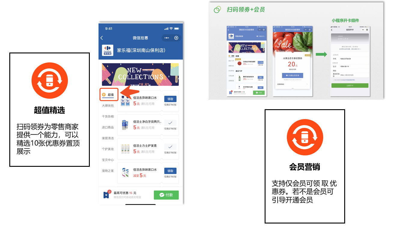 微信支付平台为商家提供了店内扫码领券的营销应用,商家可快速配置扫码领券的活动,下载二维码后铺设物料,即可开展店内扫码直达优惠的活动;用户到店之后可以扫场内的二维码直接领优惠券,收银使用微信支付即可自动核销已领取的微信支付代金券。