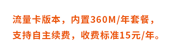 流量卡版本,内置360M/年套餐,支持自主续费,收费标准15元/年。