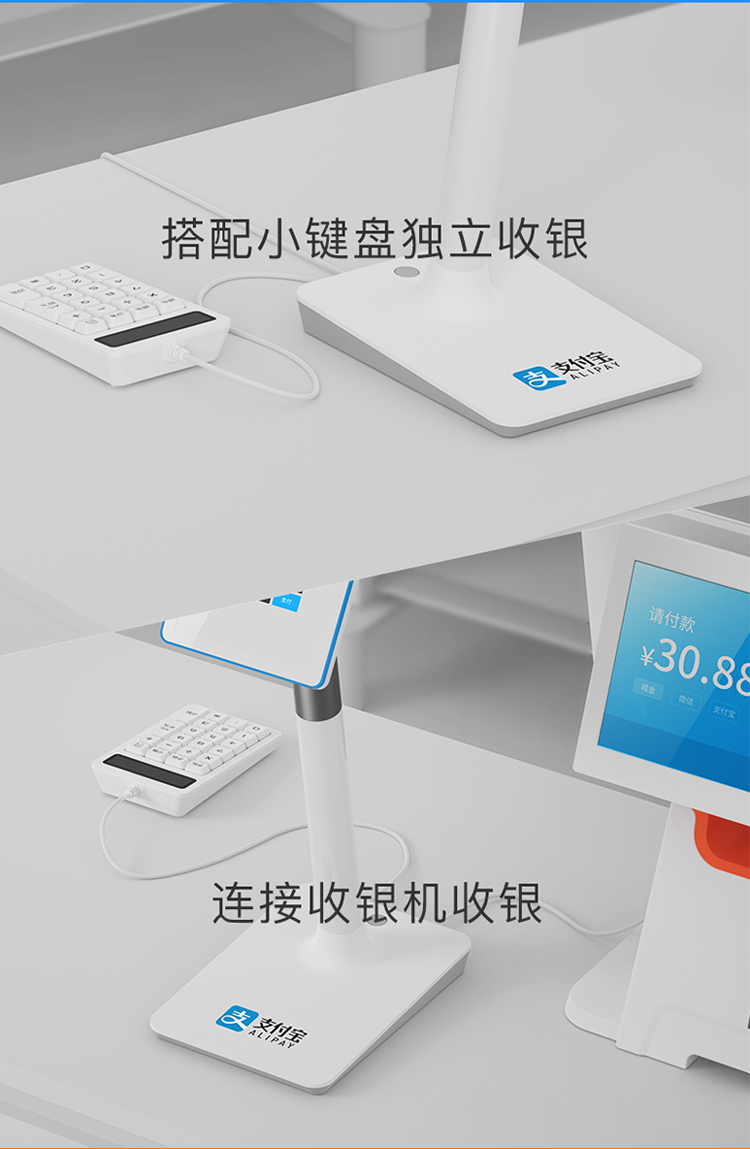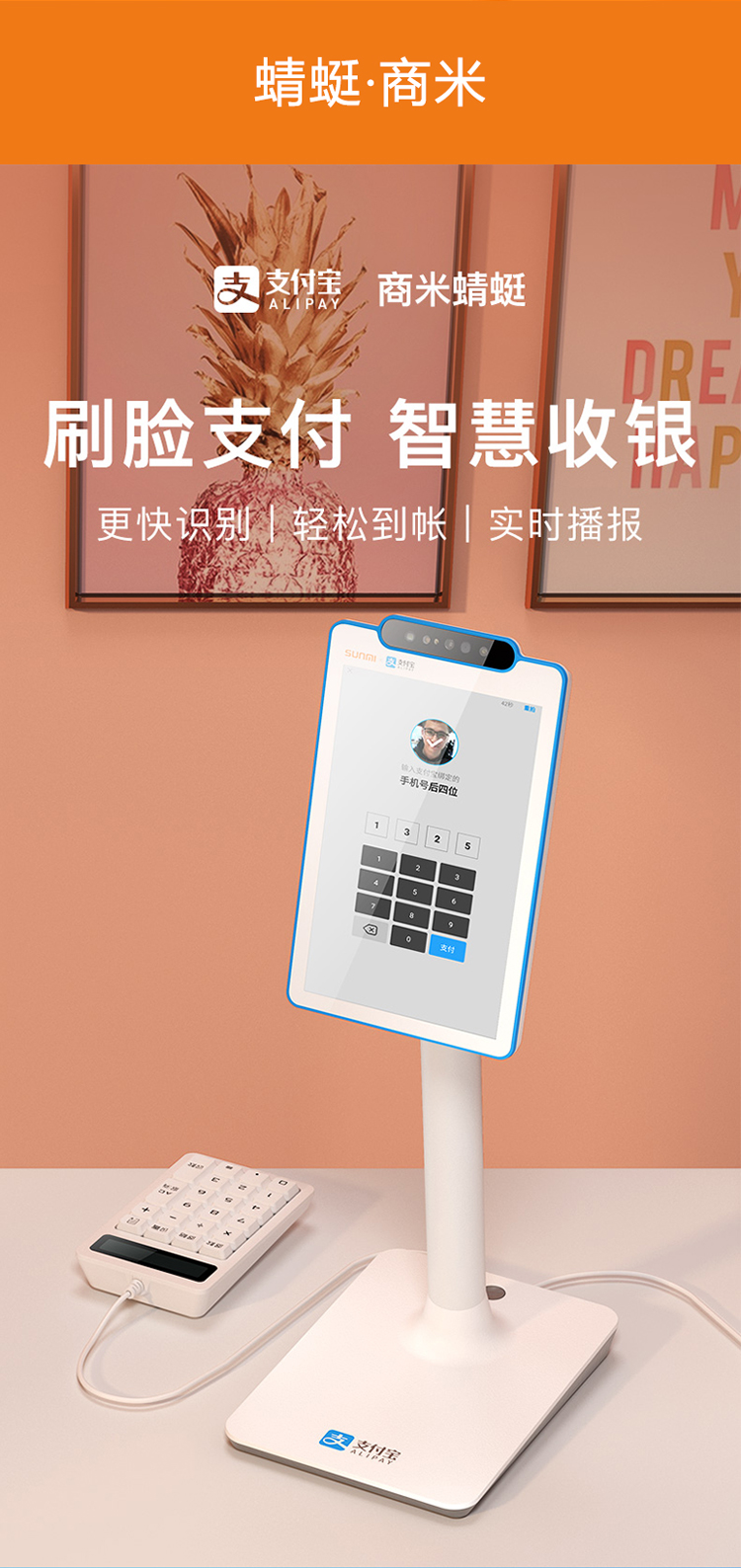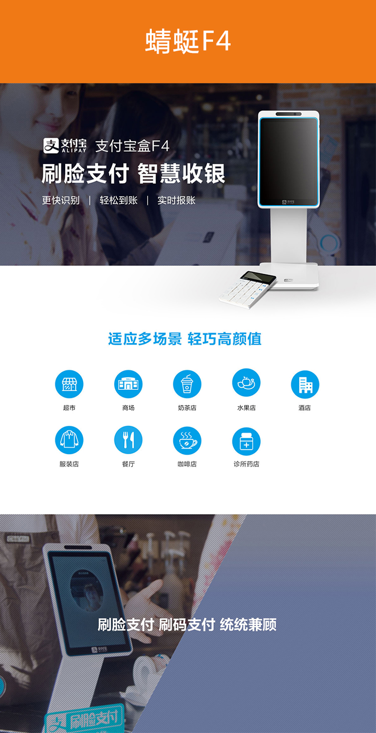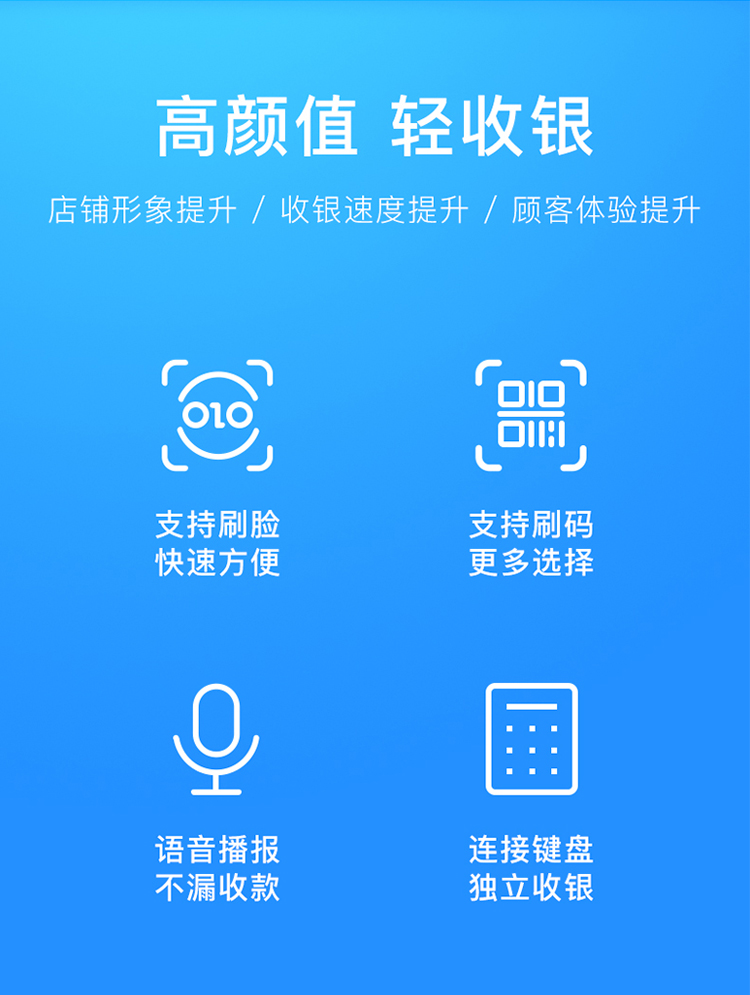 快速识别,轻松到账,实时报账,店铺形象提升、收银速度提升、顾客体验提升,支持刷脸、快速方便,支持扫码、更多选择,语音播报、不漏收款,连接键盘、独立收银,适应更多场景,轻巧高颜值