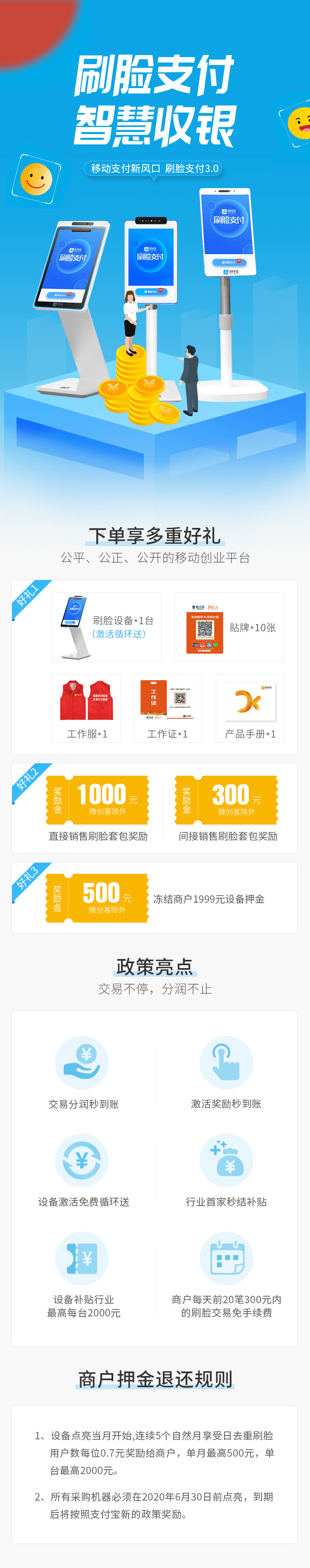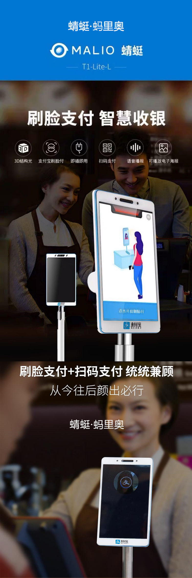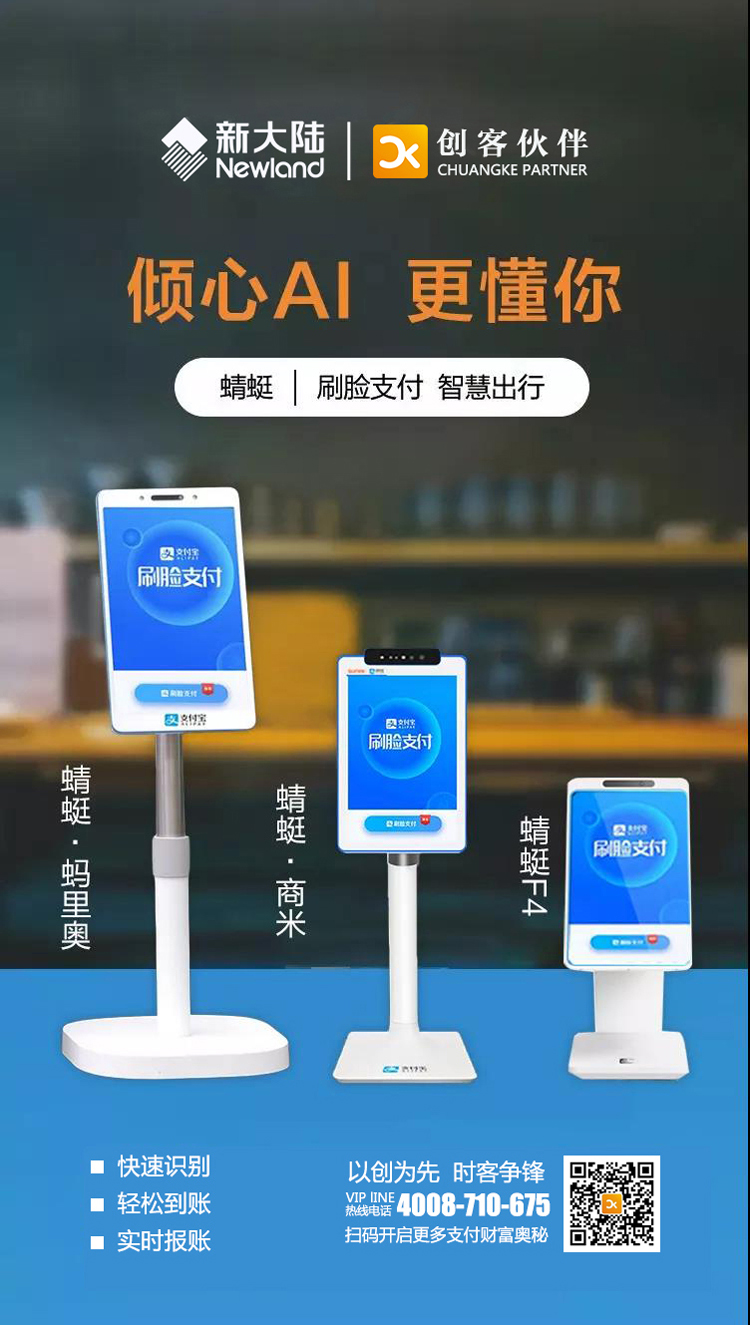 快速识别,轻松到账,实时报账,店铺形象提升、收银速度提升、顾客体验提升,支持刷脸、快速方便,支持扫码、更多选择,语音播报、不漏收款,连接键盘、独立收银,适应更多场景,轻巧高颜值